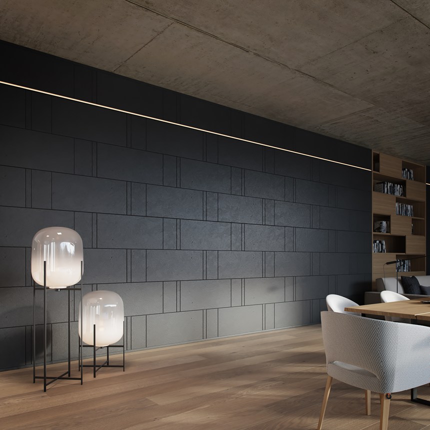 El panel mural SCURETTO es una referencia a la piedra tallada y a su estructura mineral. Con sus finas incisiones, el elemento ofrece una variedad casi infinita de combinaciones, produciendo un resultado decididamente contemporáneo. Repetir, invertir, girar, insertar... Este elemento de diseño único fue concebido con espíritu de modularidad y asimetría. Los perfiles de acabado FL11 y WL10 se han diseñado específicamente para completar la composición de la pared creada con SCURETTO, ampliando aún más el abanico de posibilidades.