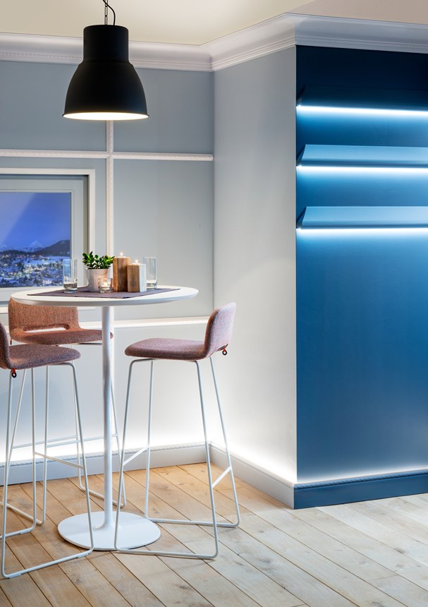 Cornisas, guardasillas, zócalos y decoración mural que se combinan con la iluminación directa o indirecta para crear un ambiente