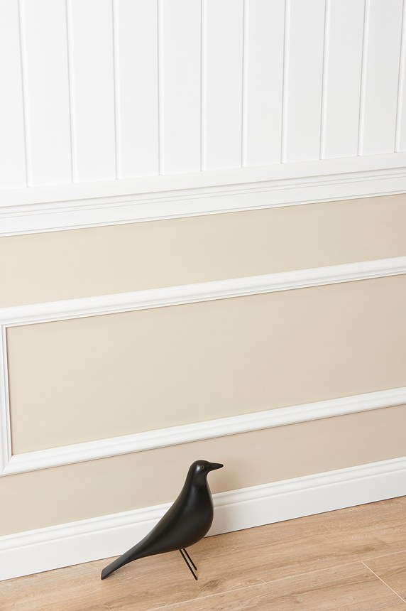 Decoração de parede com painéis de parede, revestimento, rosetas e rodapés para dar um toque moderno ao seu interior.