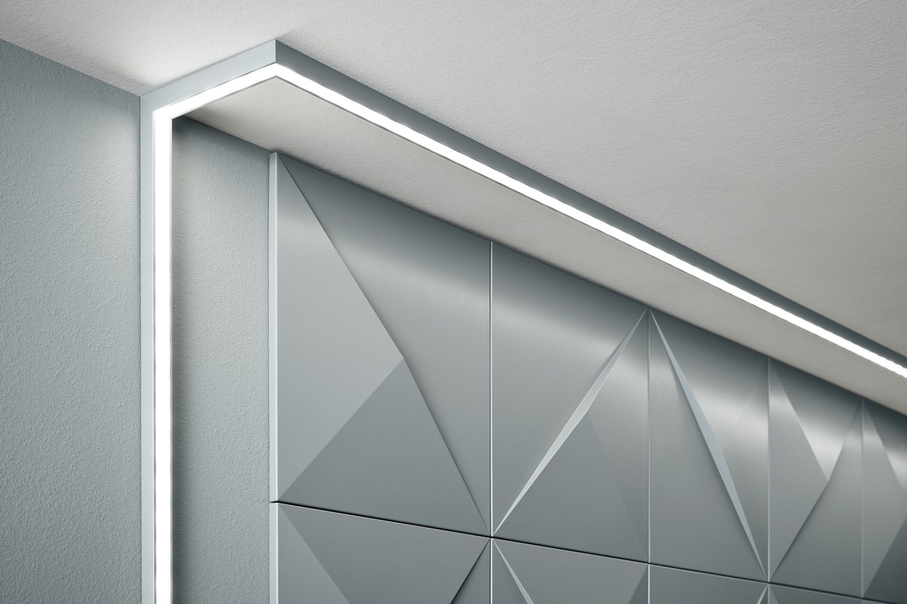 Cornijas, guardas, rodapés e decoração de parede que combinam com iluminação direta ou indireta. Para criar uma atmosfera