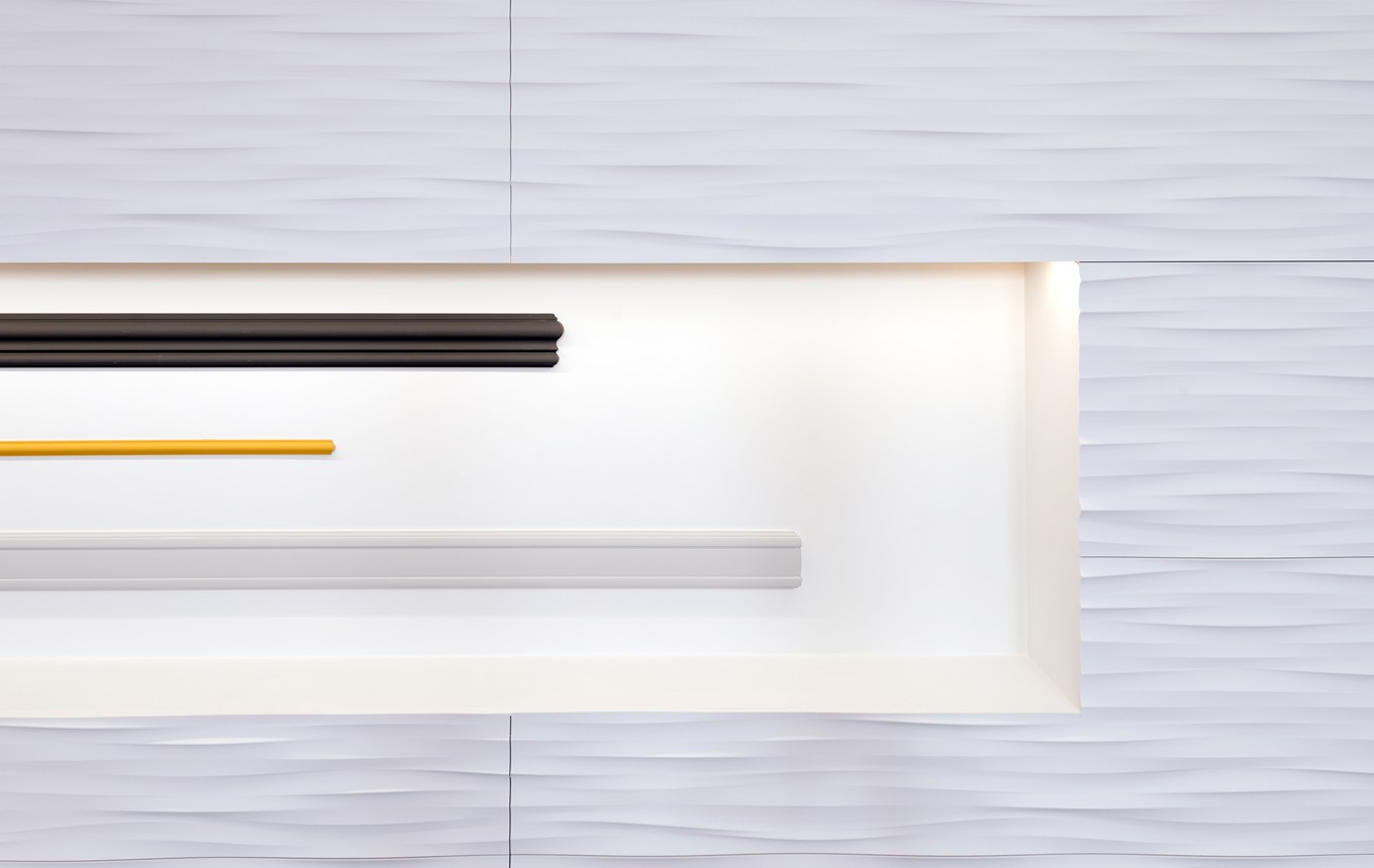 Decoração de parede com painéis de parede, revestimento, rosetas e rodapés para dar um toque moderno ao seu interior.