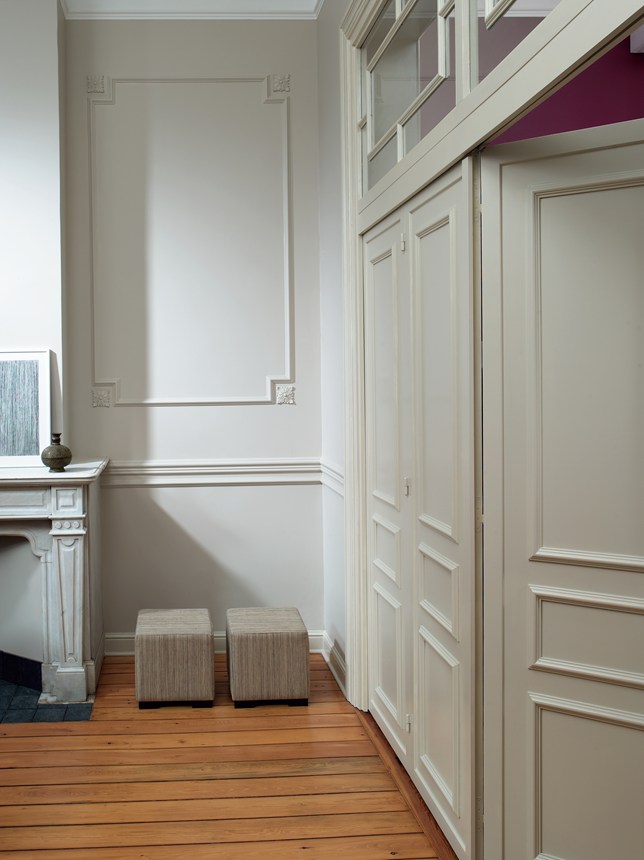 Decoração de parede com painéis de parede, revestimento, rosetas e rodapés para dar um toque moderno ao seu interior.