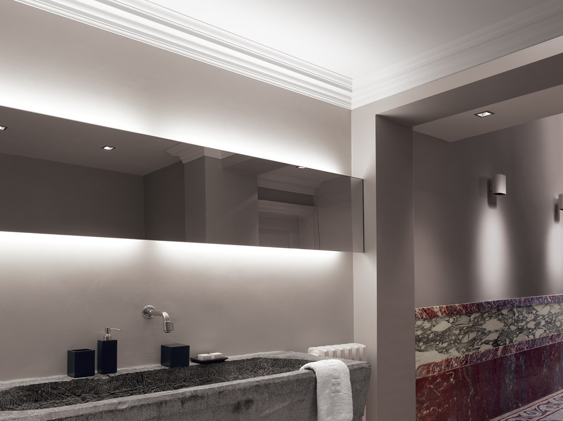 Cornijas, guardas, rodapés e decoração de parede que combinam com iluminação direta ou indireta. Para criar uma atmosfera