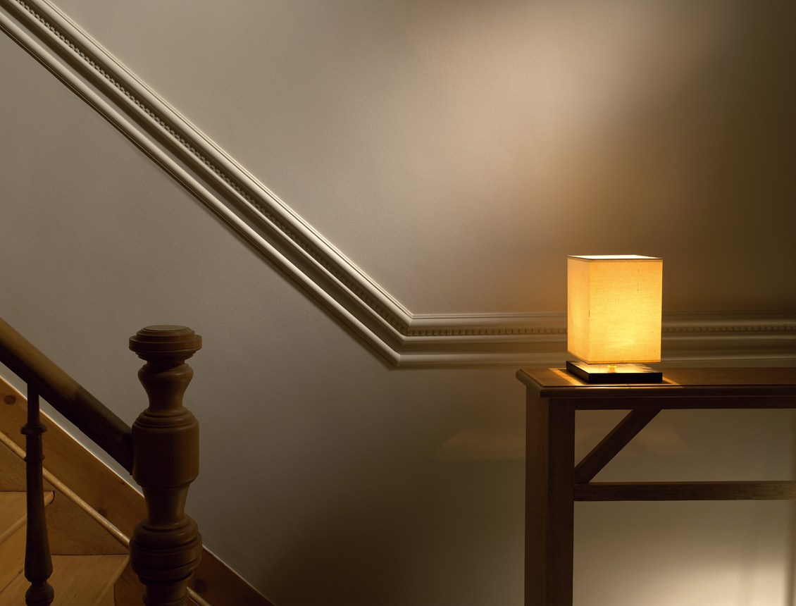 Cornijas, guardas, rodapés e decoração de parede que combinam com iluminação direta ou indireta. Para criar uma atmosfera